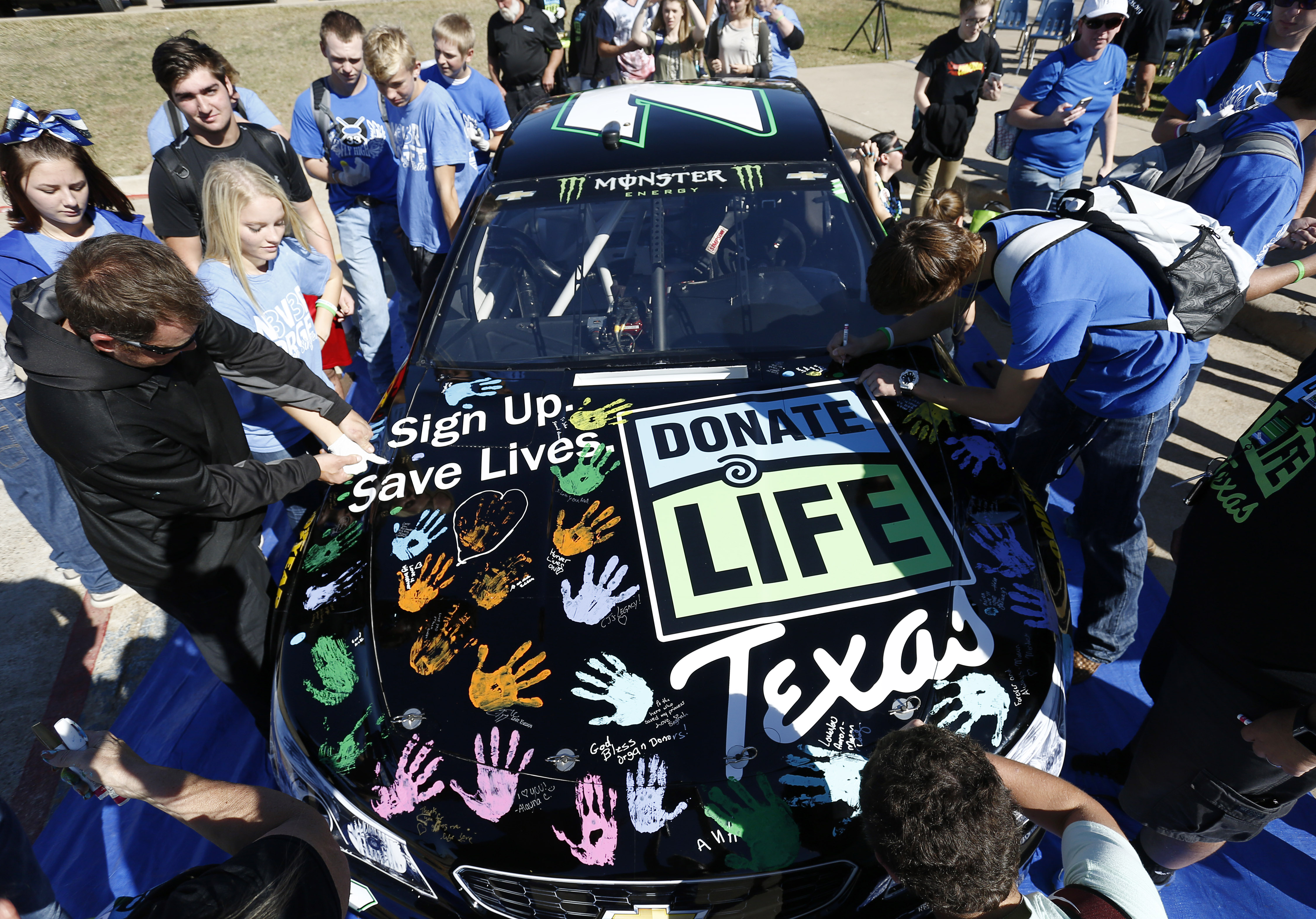 On Sunday 11/5, NASCAR driver and Donate Life advocate Joey Gase took to the track at Texas Motor Speedway for the AAA Texas 500 Monster Energy Cup Series race. Gase’s Donate Life Texas #7 car featured photographs of 21 Donate Life Honorees – people whose lives have been personally touched by donation. During the car’s unveiling event, each Honorees also applied painted handprints to the hood and trunk of the car as part of what has become a Gase tradition called “Handprints of Hope.”